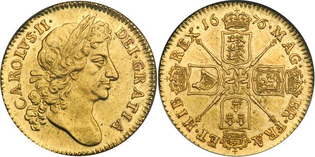 | Seaby 3344 | Charles II AV Guinea. 1676. CAROLVS II DEI GRATIA, fourth laureate bust right / MAG BR FRA ET HIB REX. 16-76, four crowned shields and sceptres around four interlocked Cs. Fr287. | Text | Image |