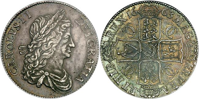 | Seaby 3350 | Charles II AR Crown. CAROLVS II DEI GRATIA, first bust, laureate and draped right / MAG BR FRA ET HIB REX 16-63, four crowned shields, pairs of interlocked Cs between, around a sunburst with cross at centre, XV on rim. | Text | Image |
