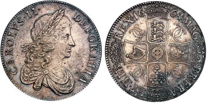 | Seaby 3355 | Charles II AR Crown. CAROLVS II DEI GRATIA, laureate and draped second bust right / MAG BR FRA ET HIB REX. 16-64, four crowned shields, pairs of interlocked Cs between, around sunburst with cross at centre. Seaby 3355. | Text | Image |