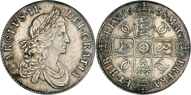 | Seaby 3357 | Chares II AR Crown. CAROLVS II DEI GRATIA, second bust, laureate and draped right / MAG BR FRA ET HIB REX. 16-68, four crowned shields, pairs of interlocked Cs between, around sunburst with cross at centre. VICESIMO on rim. | Text | Image |