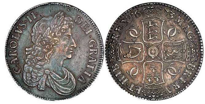 | Seaby 3358 | Charles II AR Crown. CAROLVS II DEI GRATIA, third bust, laureate and draped right / MAG BR FRA ET HIB REX. 16-73, four crowned shields, pairs of interlocked Cs between, around sunburst with cross at centre / V. QVARTO on edge. | Text | Image |