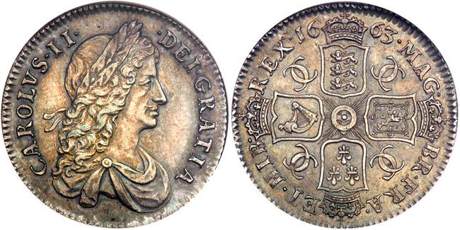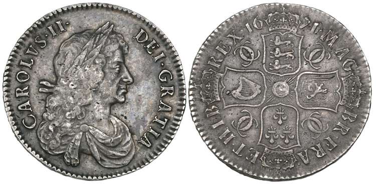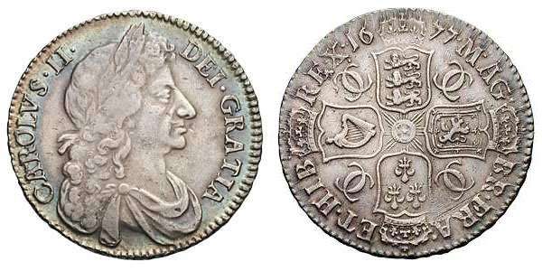 | Seaby 3366 | Charles II, AR Halfcrown, 1671, Third Bust type. CAROLVS II DEI GRATIA, laureate and draped bust right. / Crowned cruciform shields with interlinked Cs in angles. Regnal year V TERTIO on edge in raised letters. Seaby 3366; ESC-468. | Text | Image |