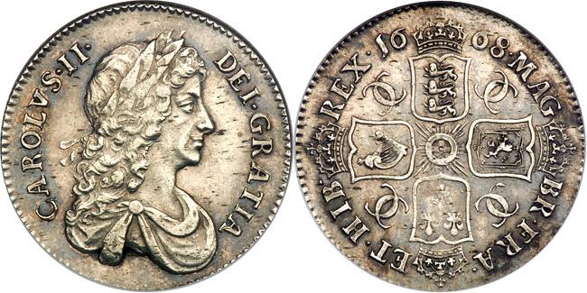 | Seaby 3375 | Charles II AR Shilling. CAROLVS II DEI GRATIA, second bust, laureate and draped right / MAG BR FRA ET HIB REX. 16-68, four crowned shields, pairs of interlocked Cs between, around sunburst with cross and central dot at centre. ESC 1030. | Text | Image |
