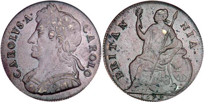 | Seaby 3393 | Charles II AE Halfpenny. CAROLVS A CAROLO, laureate cuirassed bust left / BRITANNIA, Britannia seated left holding branch and spear, arm resting on shield, 1673 in ex. | Text | Image |