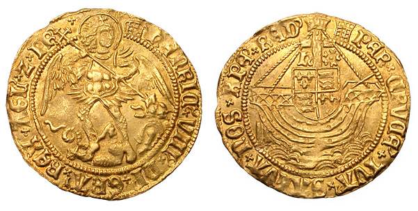 Seaby 2265 | Henry VIII AV Angel. First coinage. (portcullis) HENRICs x VIII x DI x GRA x REX x AGL x Z x R, Archangel Michael slaying dragon / (portcullis) PER + CRVCE x TVA + SALVA x NOS + XPER x REDE, ship over waves, bearing shield, mast in form of cross above with h and rose to sides. Fr 155. | Text | ![]() |