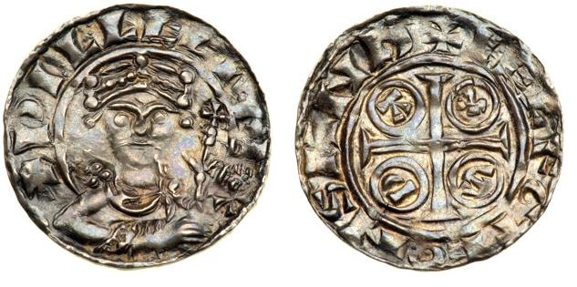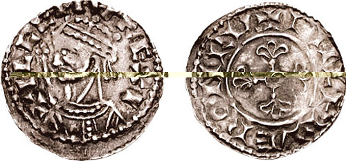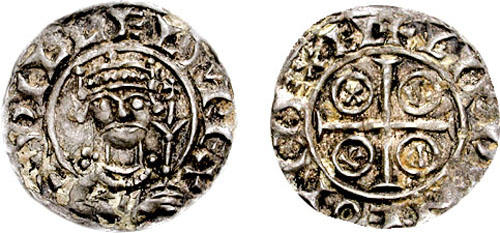 | SE 1257 Aegelric | William I AR PAXS Penny, Wareham mint, moneyer Aegelric. 1083-1086 AD. 1.39 gr. +PILLELM REX, crowned and diademed facing bust, crown of the simple double curved shape, pellets at the ends of the diadem, holding sceptre, trefoil of pellets on one shoulder, one pellet on the other / +IEGELRICONPERE, cross with the letters PAXS in circles in the angles. S. 1257; N. 848; BMC type III, 1031. | Text | ![]() |