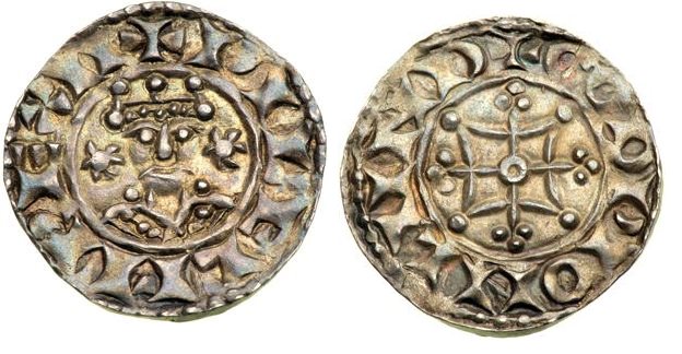 | SE 1254 Dorstan | William I, AR Penny. Lincoln mint, ca 1074-1077. Two Stars type. Moneyer, Dorstan. +PILELM REX II N, crowned, draped and mustached bust facing, star to left and right / +DORSTAN ON LN, around cross botonnee with circle center, over quadrilateral with curved sides and pellet apexes. Seaby 1254; BMC 332. | Text | ![]() |