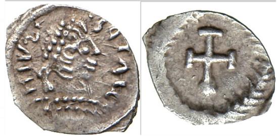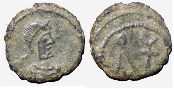 | Hilderic BMC 9 | Ostrogoths, Hilderic (523-533 AD), AE Nummus,Carthage, 6.5 mm. Pearl diademed, draped, cuirassed bust right / Cross Potent within wreath. MEC 1, 24-5; BMC Vandals 9. | Text | ![]() | |