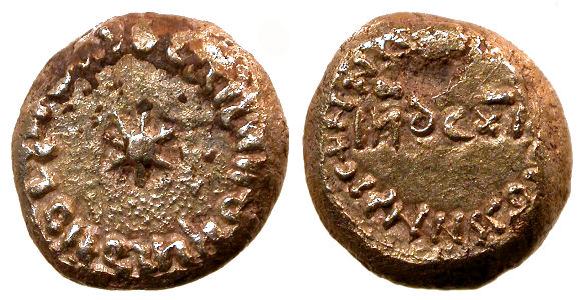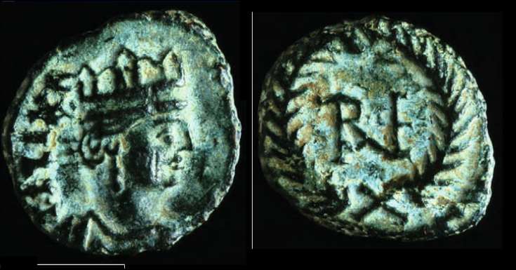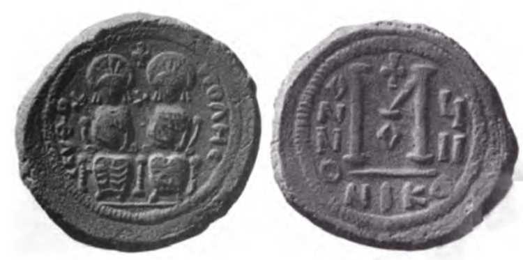 | Arab-Byz. Gerash 509 | Justin II and Sophia, AE29 follis, Arabic imitation, Scythopolis, Palestine mint, after AD 641. CKYΘO-OΠOΛHC (but unclear), Justin left and Sophia right, seated facing on double-throne, each holding a long sceptre and resting one hand on knee, cross between their heads. / Large M, ANNO to left (Ns retrograde), cross above, OX star in right field, Epsilon below. Mintmark NIK. Gerash hoard 509 (this coin). | Text | ![]() | |