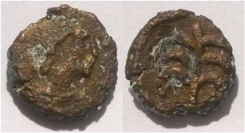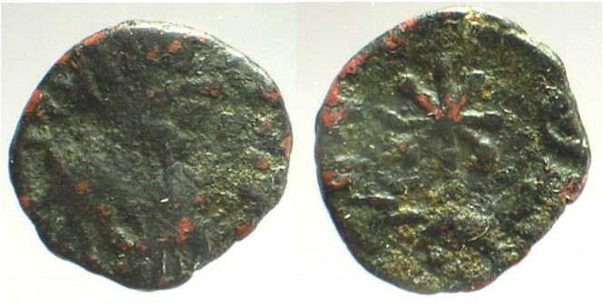 | Vandals BMC 182-194 | Vandals, AE9, uncertain, under Gaiseric or Huneric, Rome, in the name of Theodosius II, AD 408-450. 0.69 g. Garbled legend, pearl diademed, draped, cuirassed bust right. / Garbled legend, cross. BMC Vandals 182-194. | Text | ![]() | |