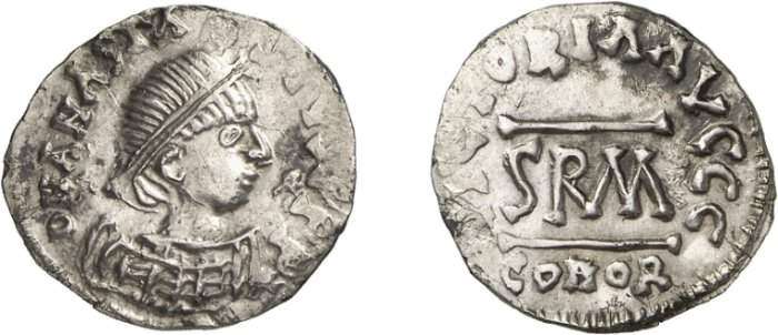 | Theoderic Gennari 131 | Theoderic, king of the Gepides, AR half-siliqua in the name of Anastasius I. 1.90 g. Sirmium. ca AD 493-526. DN ANASTASIVS P PP, pearl diademed, draped, cuirassed bust right / VICTORIA AVCCC around SRM between two horizontal lines. Mintmark COMOR. Gennari 131. | Text | ![]() | |