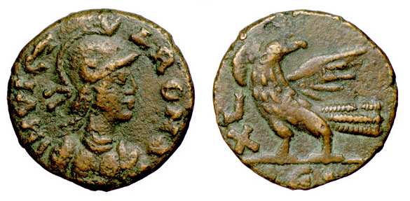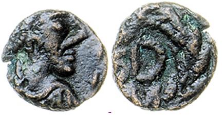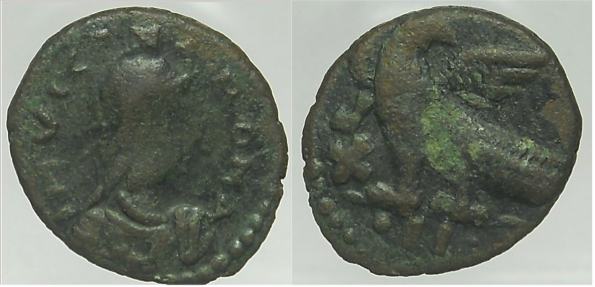 | Vandals Wroth 107 | Vandals, North Africa, Imitative of Marcian, 5th Century A.D. AE 4, 0.773 g, 11.4 mm. Pearl-diademed, draped and cuirassed bust right / monogram 107 or 108 in laurel wreath with no termination. | Text | ![]() | |