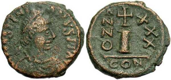 | Italy Hahn 99@3 | Justinian I AE Decanummium. Dated Year 30 = 556-557 AD, of an Imitative Italian Mint. D N IVSTINIANVS P P AVG, diademed, draped and cuirassed bust right / large I surmounted by cross, ANNO to left, XXX to right, CON in ex. Hahn MIBE 99.3-6, p. 170, Plate 35. | Text | ![]() | |