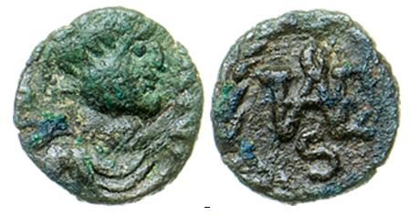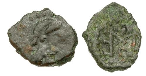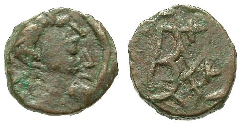 | Gelimer BMC 4 | AE 10mm of Gelimer. 530-534 AD. GEIL, pearl diademed, draped, cuirassed bust right / CM shaped monogram of Gelimer in wreath. BMC Vandals Gelimar, 4-6; MEC 1, 28-30. | Text | ![]() | |