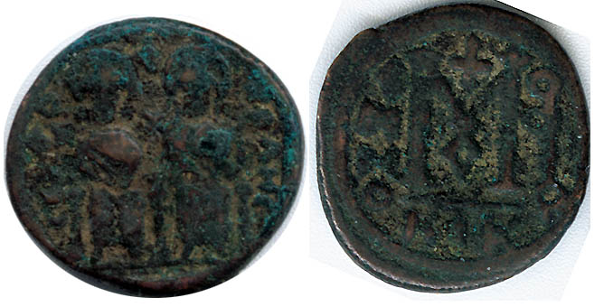 | Arab-Byz. BMC 2 | AE26 Arab-Byzantine imitative issue. Justin and Sophia seated facing / Large M, inscription around. | Text | ![]() | |