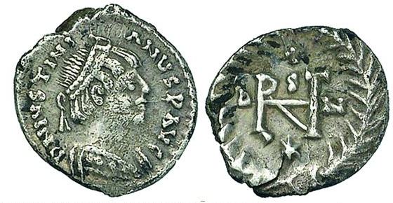 | Lombards BMC 4ff | Lombards, Lombardy. Ca 565-572. AR Half Siliqua (0.60 g, 6h). In the name of Justinian I or Justin II. Struck ca 527-578. D H IVS [...] S PD IVI, diademed, draped, and cuirassed bust right / Large Chi-Rho set on globe, six-rayed star on either side of base; all within wreath. Cf. MEC 1, 295-7 (Justinian I); Arslan -; BMC Vandals 4-8 (Justinian I) and 14 (Justin II). | Text | ![]() | |