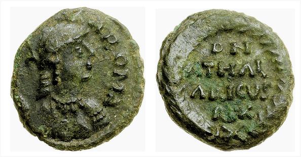 | Athalaric BMC 52 | Athalaric, AE 4, 1.048 g, 9.7 mm, Ravenna mint. JVST-INIANII (blundered), diademed and cuirassed bust of Justinian I right / monogram of Athalaric in wreath. BMC Ostrogoths p. 67, 52. | Text | ![]() | |