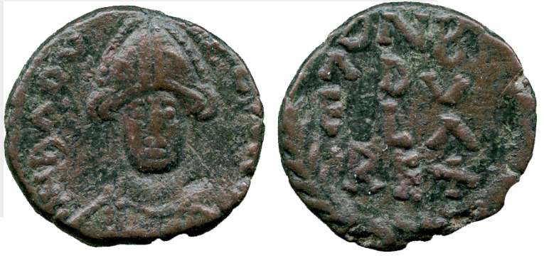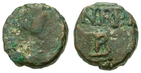 | Theoderic BMC 58 | Ostrogoths, Theoderic. AE11, 5 nummi in the name of Justin II. AD 493-526. Ravenna mint. 1.22 g. DN IVSTIN I P, pearl diademed, draped, cuirassed bust right. / Large V within wreath, star above. BMC Vandals 58; Kraus 96. | Text | ![]() | |