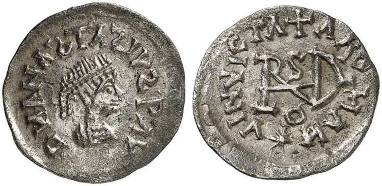 | Theoderic BMC 27 | Theoderic (or Witigis), Ostrogoths, AR quarter-siliqua in the name of Justin I. Struck 493-526 AD. DN IVSTI-NVS PF AVG, pearl diademed, draped, cuirassed bust right / RAV ED type monogram of Theoderic and Witigis, cross and S above, o below, all within wreath. cf BMC 27; Museo Ravenna 305-306; Arslan P. 38, 41. | Text | ![]() | |