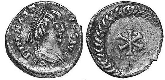 | Theoderic BMC 73 | Theoderic, struck for Anastasius. Rome. 493-518 or 526 AD. Half Siliqua. 16mm. DN ANASTASIVS P AVG, pearl-diademed, draped and cuirassed bust right, cross above / INVICTA ROMA, Victory, in chiton and peplos, advancing right, holding wreath and resting trophy on shoulder. S-C across fields, unclear mintmark. BMC Vandals p. 57, 73. | Text | ![]() | |