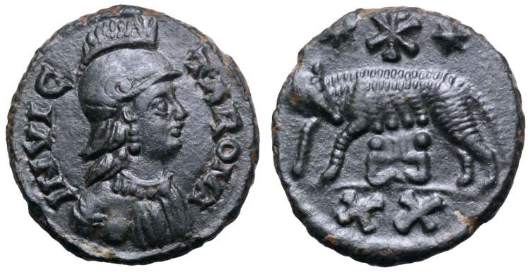 | Theoderic BMC 24 | Theoderic, Ostrogoths, AE follis (40 nummi). 512-522 AD. 15.79 gr, 28.50 mm. INVICTA ROMA, helmeted, draped bust of Roma right / XL above she-wolf standing left, suckling Romulus and Remus. Mintmark: dot II dot. BMC p. 104, 24; Wroth 24. | Text | ![]() | |