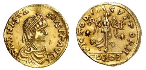 | BMC 9 | Anastasius, AV Tremissis, struck in Rome under Theodoric. AD 491-526. 1.4 g. Rome. D N ANASTASIVS P F AVG, pearl-diademed, draped, cuirassed bust right. / VICTORA ACVSTORN, Victory walking right, head turned left, holding wreath and cross on globe. Star in left and right fields. BMC Vandals 9; Hahn MIB 36-11. | Text | Image |