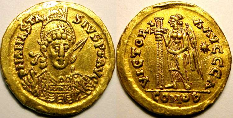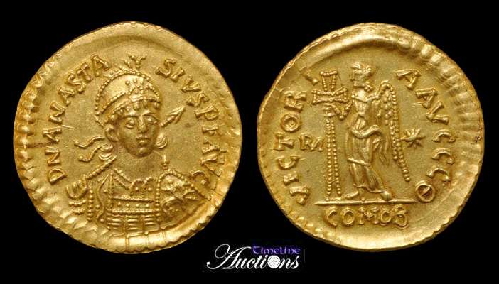 SB 4 | Anastasius I. 491-518 AD. AV Solidus, 4.47 gm. Constantinople mint. D N ANASTA-SIVS P P AVG, helmeted and cuirassed bust, three-quarters facing to right, holding spear over shoulder and shield decorated with horseman spearing a fallen enemy / VICTORI-A AVGGG, Victory standing left, holding staff surmounted by reversed Chi-rho; star in left field; mintmark CONOB. DOC I 6 var. (officina); MIB 6; BN 8 var. (same); SB 4. | Text | Image |