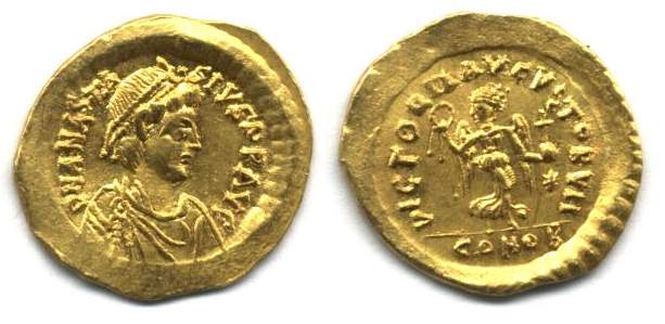 | Hahn MIB 7 | Anastasius, AV solidus, struck under Theodoric. AD 491-518. 20.46 mm, 4.40 g. Rome. D N ANASTASIVS P F AVG, helmeted, pearl-diademed and cuirassed bust facing three-quarters right, holding spear and shield with horseman and enemy motif / VICTORIA AVGGG and officina letter Theta, Victory standing left, holding long jewelled cross; RM monogram in left field, star in right field. Mintmark COMOB. Hahn MIB I 7; BMC Vandals 4; Lacam 91; Mettlich 6. | Text | Image |