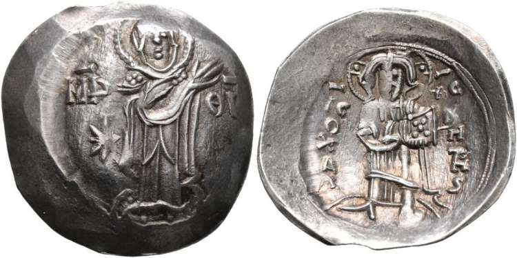 | SB 2148 | Andronicus I Gidon, emperor of Trebizond, AR aspron trachy, AD 1222-1235. 25 mm, 2.99 g. Nicaea mint, MP-ΘV to left and right of Mary, Mary, nimbate, standing slightly right, hands raised. / IC–XC across upper fields, O X A Λ down left field, K H TH C down right field, Christ Chalcites standing facing, holding book of gospels and raising right hand. SB 2148. (Reattributed by Bendall to Andronicus I Gidon.) | Text | Image |