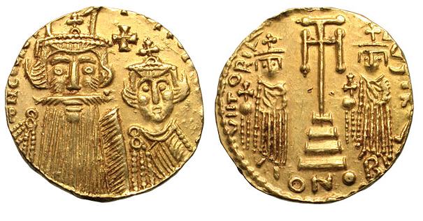 | SB 963 | Constans II and Constantine IV, AV Solidus Constantinople mint. legend often fragmentary, facing busts of Constans, with long beard on left, wearing plumed helmet, and Constantine, beardless, on right, crowned; each wearing chlamys; cross between their heads / VICTORIA AVGU and officina letter, long cross on globe between facing standing figures of Heraclius on left and Tiberius on right, both beardless, each wearing crown and chlamys and holding cross on globe; mintmark CONOB+. SB 963. | Text | Image |