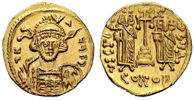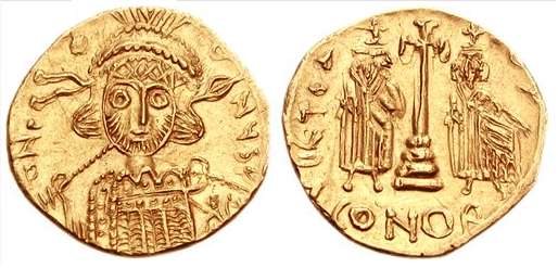 SB 1189A | Constantine IV. 668-685 AD. AV Solidus, Carthage mint. D ON (sic) COS V P, helmeted and cuirassed bust facing, holding spear over shoulder and shield / Cross potent on steps between Heraclius and Tiberius, standing facing, each crowned and wearing chlamys, each holding cross on globe; indictional year H in left field; retrograde S in right field; mintmark CONOB. MIB II 25 (Sardinia); SB 1189A. | Text | Image |