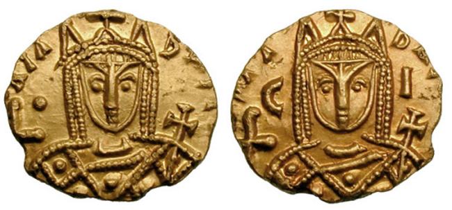 | SB 1599 | Irene. Sole reign. 797-802 AD, AV Solidus, Constantinople mint. EIRINH bASILISSH, crowned facing bust of Irene, holding cross on globe and sceptre surmounted by cross / dot EIRINH bASILISSH Q (or X), same bust type as obverse. DOC 1; BN 1-5; SB 1599. | Text | Image |