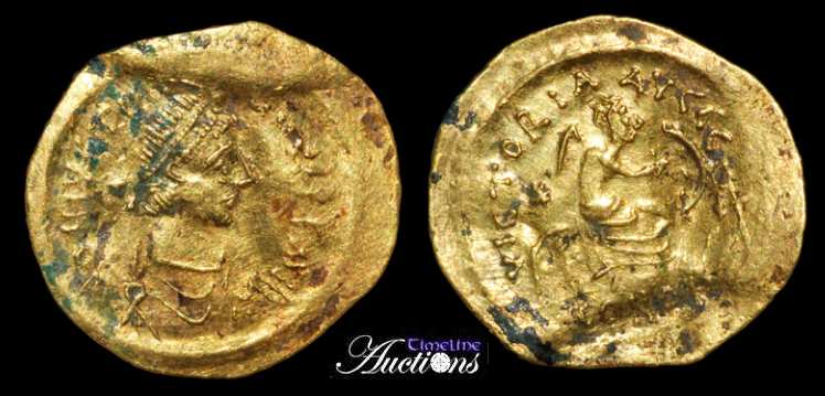 | Gemini 526 | Visigothic Kingdom, Pseudo-Imperial Issue in the name of Justinian I, AV Solidus. ca 538-554 AD. D N STIA—NS P—P AV (the first N & S retrograde), facing bust of Justinian I, helmeted, holding spear over shoulder and shield decorated with horseman / VICTOI—I [2-3 letters obscured by die break] CCC IV, Victory standing facing, holding long cross & cross on globe, CONOB in exergue, star in right field. | Text | Image |