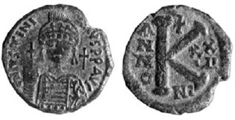 | SB 285 | Justinian I, Half follis, 527-565 AD. minted in Constantine in Numidia. DN IVSTINIANVS PP AVG, helmeted, cuirassed bust facing, holding cross on globe and shield / Large K, ANNO to left, cross above, (regnal year) XV to right. Mintmark: CON. SB 285, MIB 243 var. | Text | Image |