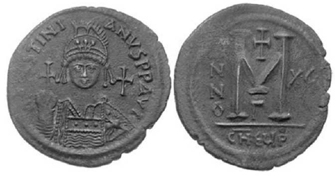 | SB 237 | Justinian I, AE Decanummium, Antioch, AD 527-565. DN IVSTINIANVS PP AVG, helmeted, cuirassed bust facing, holding cross on globe and shield, cross to right / Large I, ANNO to left, cross above, XXIIII to right, mintmark THUΠ. Sear Byz 237; MIB 158. | Text | Image |