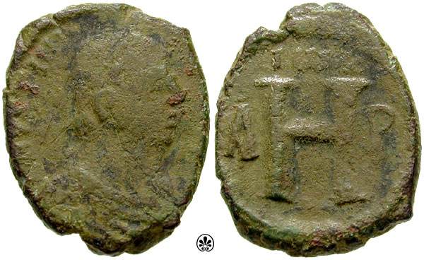 | MIBE 144a | Justinian I, AE follis. Antioch. AD 527-565. Dated year 16. DN IVSTINIANVS PP AVG, helmeted, cuirassed bust facing, holding cross on globe and shield, cross in right field / Large M, ANNO to left, cross above, XG to right, Γ below. Mintmark CHEU O over P. MIBE additions 8 in MIN 30; MIBE 144a; SB 219 var (mintmark); DOC 216 var (ditto). | Text | Image |