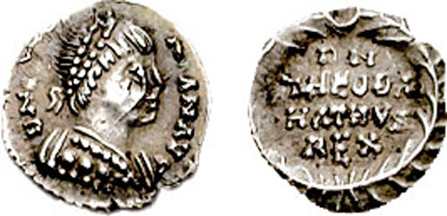 | Metlich 62 | Ostrogoths, Theodahad, in the name of Justinian I. 534-536 AD. AR Quarter Siliqua. Pearl diademed and draped bust of Justinian right / D N/THEODA/HATHVS/REX in four lines within wreath. Metlich 62; MIB I 56; MEC 1, 139. | Text | Image |