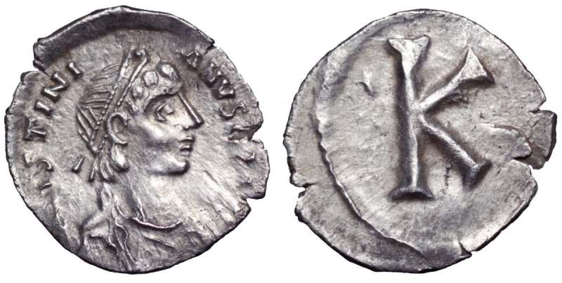 | Roma Num. V, 931 | Justinian I AR Half-Siliqua. 0.40g, 12mm. Constantinople, 200th Anniversary issue, 530 AD. DN IVSTINIANVS AVG, pearl diademed, draped, cuirassed bust right / Large K within dotted border. MIBE –; DOC –; Bendall –. Unpublished in the standard references. Roma V, lot 931. | Text | Image |