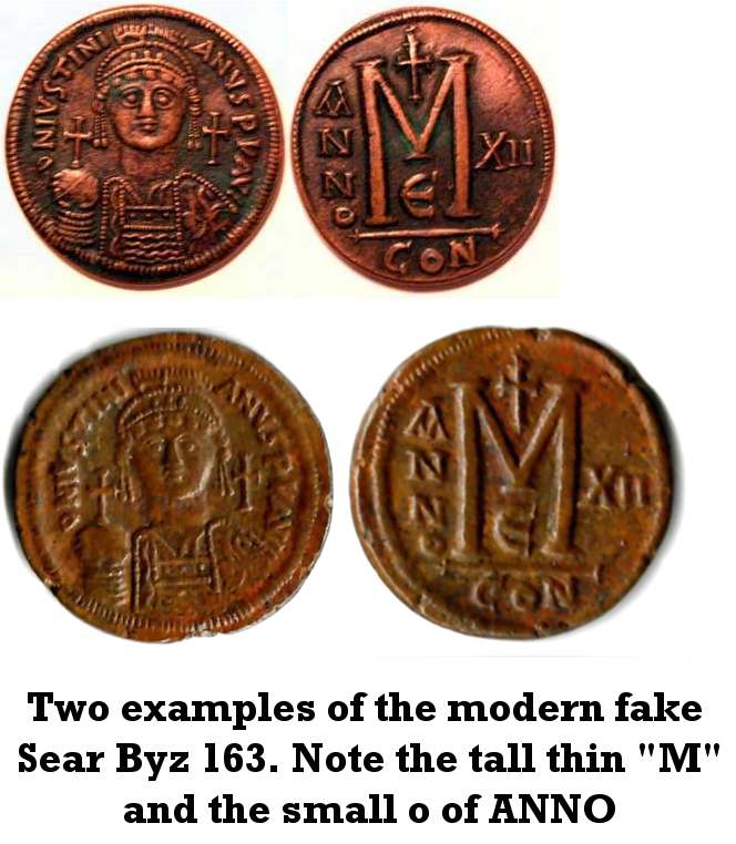 | FAKE SB 163 | MODERN FAKE Justinian I, AE Follis. Copying Constantinople. DN IVSTINIANVS PP AVG (the second P resembling a V), helmeted, cuirassed bust facing, with short pendilla, holding cross on globe and shield; cross to right. / Large (tall and thin) M, ANNO to left (the O smaller than the other letters), cross above, XII to right, officina letter Epsilon below, mintmark CON. Sear Byz Fakes Section F17. Modern FAKE of Sear Byz 163, DOC 37-61. Often offered on ebay and other sales sites. | Text | Image |