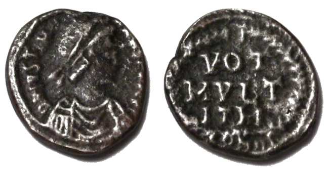| SB 157 | Justinian I, AR Siliqua, 18 mm, AD 527-565. Constantinople mint. DN IVSTINIANVS PP AG, pearl diademed, draped, cuirassed bust right / VOT MVLT MTI in three lines within wreath; mintmark CONOS. DOC I 27; MIBE 48; SB 157. | Text | Image |