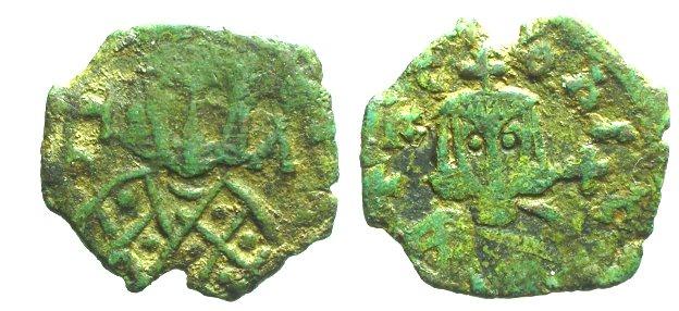 SB 1637 | Leo V and Constantine. 813-820. AE Follis 18mm, Syracuse mint. LEON, crowned facing bust of Leo, wearing loros, holding cross potent; L and cross to right / Crowned facing bust of Constantine, wearing chlamys, holding cross on globe; cross to right. DOC 18; SB 1637. | Text Text | ![]() ![]() |