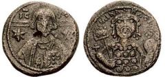 SB 1880A | Michael VII. 1071-1078 AD. AE Follis 8.57 gm. Constantinople. IC-XC at top left and top right of nimbate bust of Christ facing, nimbate cross behind head, right hand raised, holding book of gospels in left hand, star to left, star to right / MIXAHL RACIL O D, bearded bust of Michael VII facing, wearing crown and loros, holding labarum and cross on globe. (as SB 1878 but on a smaller flan from smaller dies). Sear 1880A. | Text Text | Image Image |