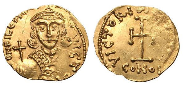 | SB 1452 | Philippicus. 711-713 AD. AV tremissis. Constantinople. [D (retrograde) N FILEPICUS] MULT[US AN], facing bust, with short beard, wearing crown and loros, and holding cross on globe in right hand and eagle-tipped sceptre surmounted by cross in left / VICTORIA AVS[U], cross potent on base, CONOB beneath. Berk 206. MIB 6. Sear 1452. | Text | Image |