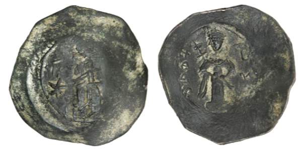 | Grierson 1127 | Theodore Mankaphas, Billon Stamenon, ca 1188-1189, Philadelphia mint. 25 mm, 3.86 g. IC-XC, Full-length figure of Christ standing on dais, holding book of gospels and raising right hand. Six-pointed star in left field. / +ΘΔI-C B-M downwards in left and right fields, Theodore Mankaphas standing front, holding sceptre surmounted by patriarchal cross with both hands. Grierson 1127; DOC 2, pl. XXII. | Text | Image |