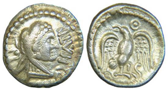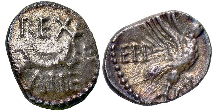 | Seaby 356 | British Celts, Eppillus, c. 25-35 AD, AR unit. EPATI Head of Hercules right / Eagle facing, wings open, head left. Van Arsdell 580-1; Nash 212. | Text | ![]() | |