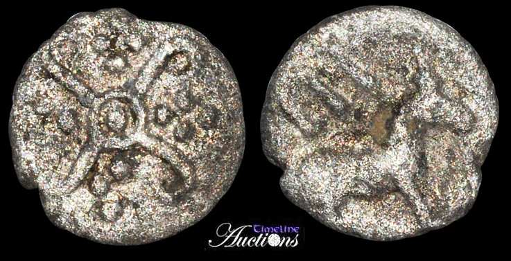 | Seaby 103 | Atrebates Kings, Eppillus. 20 BC-1 AD. AR Spiral Minim, 0.35 gr. Four-armed spiral with pellet quatrefoil in angles / EPP above goat standing right. Seaby 103; BMC 1118-1120; ABC 1172. | Text | Image | |