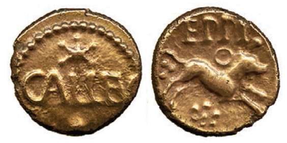 | Seaby 96 | Atrebates, Eppillus, AV Quarter-Stater, 1.16 g. ca. 10 BC–10 AD. CALLEV with star above and below. / EPPI, hound running right, circle above, daisy of dots below, three dots beneath the hound's tail. Seaby 96; Van Arsdell 408-1; BMC 1002-1005. | Text | Image | |