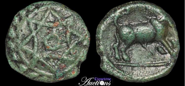 | VA 1810 | Celtic Tasciovanus, Catuvellauni, AE 2.38 g. 25 BC- AD 10 AD. Geometric eight-pointed star with circle in the centre / Bull standing right on groundline. VA 1810; Seaby 248; BMC 1752-1755. | Text | Image | ||