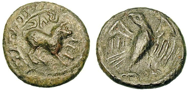 | VA 1890 | British Celts, Rues (Tasciovanus) AE Unit. ca 10 BC - 10 AD. Lion right / Eagle with spread wings standing right, head left. Hobbs 1691. | Text | Image | ||