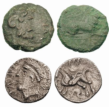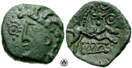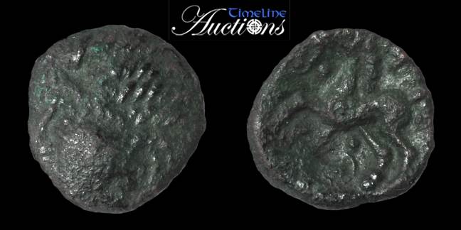 | Hobbs 2443 | Celtic, The Trinovantes. Dubnovellaunos. ca 1st Century BC. AE 15mm. Stylized head left, star before / Horse jumping right; quadral below, dot and dot in ring before. | Text | Image |